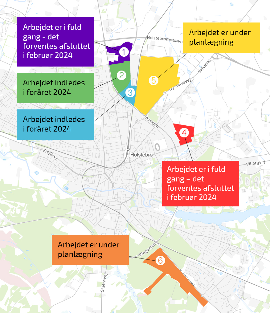 På kortet her på siden kan du se status for de i alt seks områder, der lige nu arbejdes i og med.