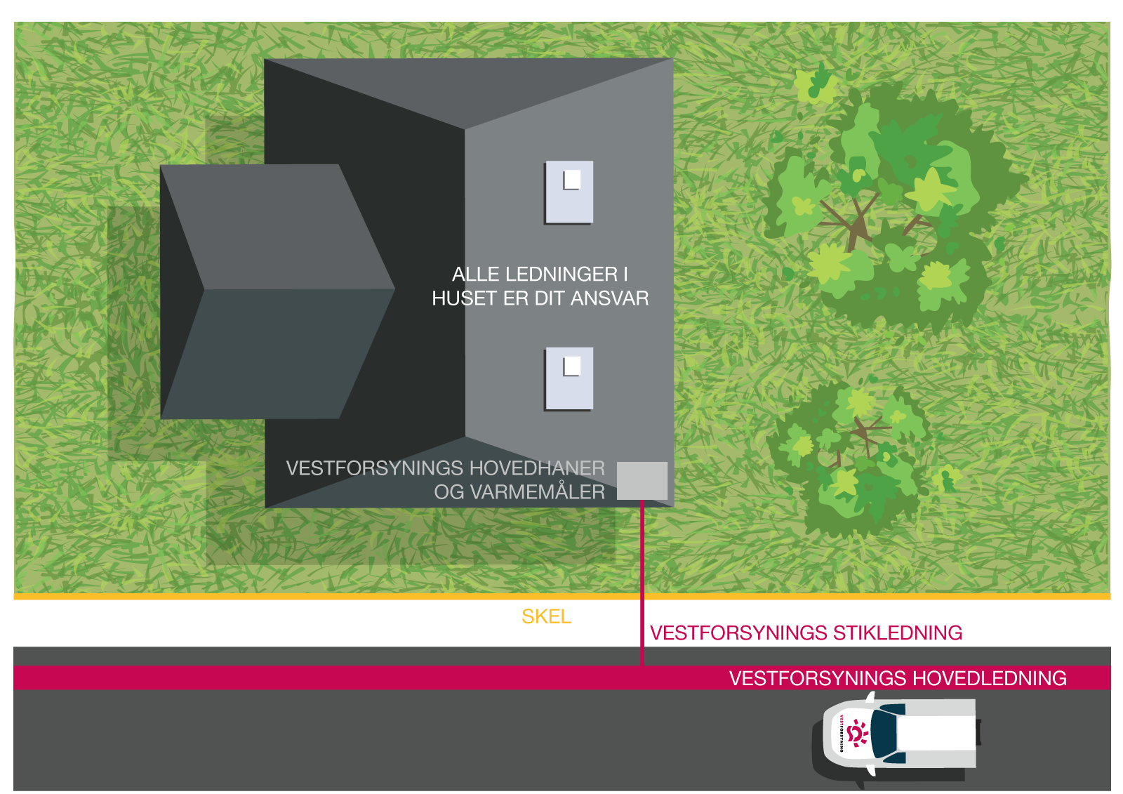 Dit ansvar for varmeinstallationen starter ved hovedhanerne, som typisk er placeret ved din ydervæg. Selve varmemåleren er Vestforsynings ejendom, men det er dit ansvar at vedligeholde alle ledninger i din fjernvarmeinstallation – det vil sige rør og ventiler omkring varmemåleren.