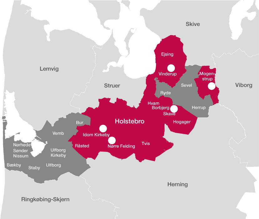 De røde felter på kortet viser de områder, som vi forsyner med rent drikkevand. Vestforsyning dækker 80 procent af vandforsyningen i Holstebro Kommune. I oplandet til Holstebro by forsynes kunderne med vand fra 11 private vandværker.