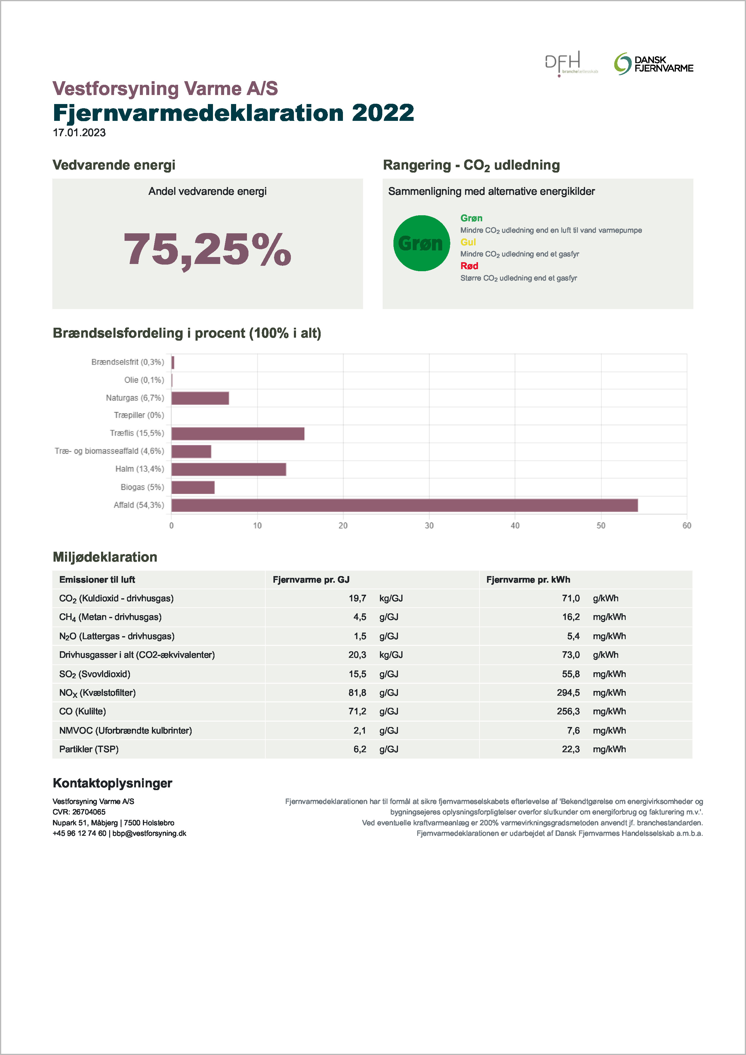 Få svar på alle spørgsmålene herVestforsyning Varme A/S har ifølge fjernvarmedeklarationen 75,25 % andel vedvarende energi og rangerer som 'grøn' i forhold til CO2-udledning sammenlignet med alternative energikilder.